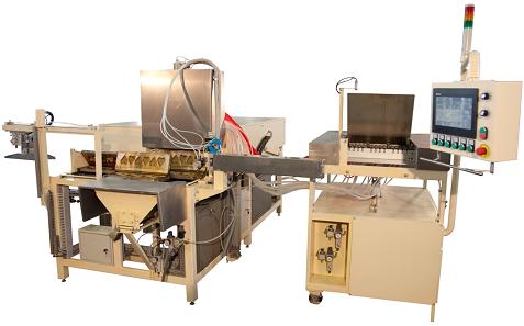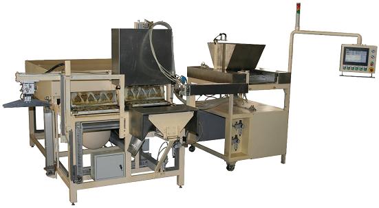 - ligne automatique pour la production d'une large gamme de produits de confiserie avec la farcissure ou sans la farcissure (cakes de biscuit avec la fourré, gaufres belges, biscuits au beurre, produits des gaufres - chips, crumbles, mini-cakes fourrés ou non fourrés, cakes classiques, muffins). La ligne représente un complexe compact multifonctionnel entièrement automatique qui se compose des éléments suivants: