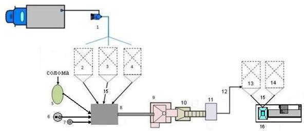 Wytłaczany produkt przez przenośnik (10) czy ręcznie wprowadza się do kruszenia w kruszarce (11). Kruszona wytłoczona mieszanka przenośnikiem pneumatycznym (12) czy ręcznie załaduje się w bunkry do przechowywania (13i 14).