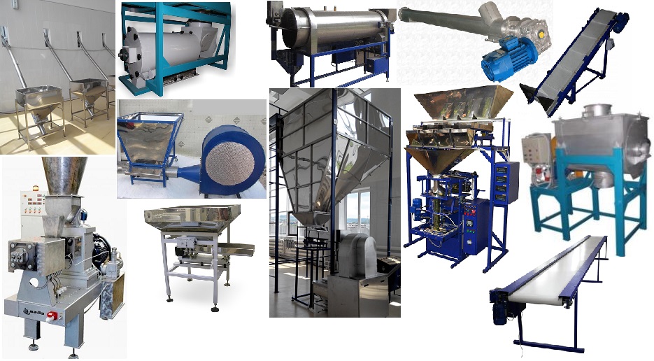 Сырье (мука, крупа) из мешков высыпается оператором в приемный бункер растаривателя (1), в растаривателе установлен шнековый транспортер, которым сырье подается в смеситель (2), предусмотрена возможность использования многокомпонентной рецептуры, смеситель смонтирован на тензодатчиках для взвеживания дозы каждлго компонента соответствено рецептуре, после набора необходимого количества каждго компонента смеситель включается (предусмотерно три компонента, можно использовать 1 растариватель, в этом случае взвешивать дозу каждого компонента нужно будет перед засыпанием в растариватель но не нужны будут тензодатчики на смесителе). Шнековым транспортером (3) смесь подается в просеиватель (4). Из просеивателя сырье шнековым транспортером (5) перемещается в загрузочный бункер экструдера (6). Предусмотрено две сменные фильеры для производства хлебцев и подушечек с начинкой.